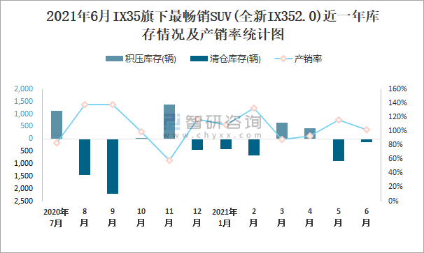 2021年6月IX35旗下最暢銷SUV(全新IX352.0)近一年庫存情況及產銷率統計圖