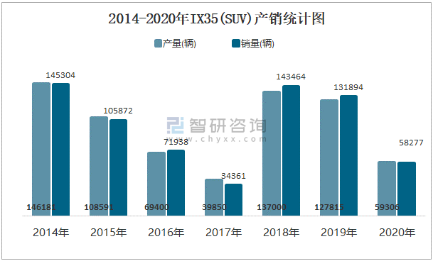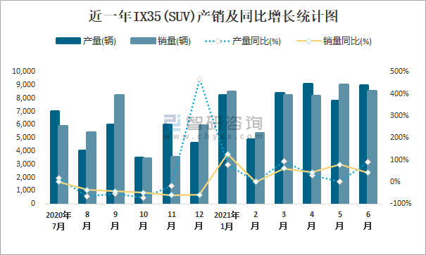 根據中國汽車工業協會數據可知:2021年6月IX35(SUV)產量為9000輛,同比增長91.5%,銷量為8574輛,同比增長41.7%,當月產銷率為95.27%;2021年上半年IX35(SUV)產量為47408輛,同比增長68.1%,銷量為47868輛,同比增長85.3%,產銷率為100.97%;2014-2020年IX35(SUV)產銷量2018年起逐年遞減,且近7年總銷量大于總產量,清倉庫存2967輛。