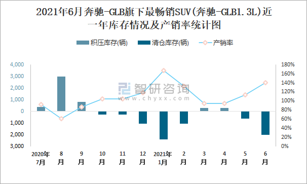 2021年6月奔馳-GLB旗下最暢銷SUV(奔馳-GLB1.3L)近一年庫存情況及產銷率統計圖