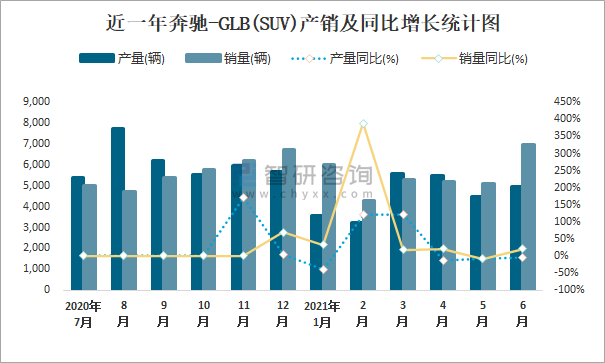 根據中國汽車工業協會數據可知:2021年6月奔馳-GLB(SUV)產量為4972輛,同比下降6.1%,銷量為7000輛,同比增長20.7%,當月產銷率為140.79%;2021年上半年奔馳-GLB(SUV)產量為27336輛,同比增長3.7%,銷量為32915輛,同比增長28.6%,產銷率為120.41%;2019-2020年奔馳-GLB(SUV)產銷量大幅度增加,且近2年總產量大于總銷量,積壓了庫存7039輛。