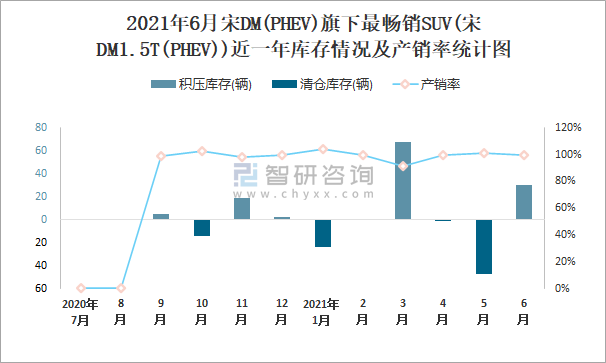 2021年6月宋DM(PHEV)旗下最暢銷SUV(宋DM1.5T(PHEV))近一年庫存情況及產銷率統計圖