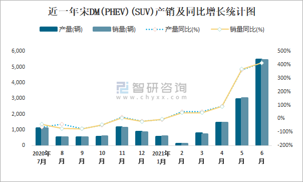 根據中國汽車工業協會數據可知:2021年6月宋DM(PHEV)(SUV)產量為5480輛,同比增長414.1%,銷量為5450輛,同比增長414.2%,當月產銷率為99.45%;2021年上半年宋DM(PHEV)(SUV)產量為11343輛,同比增長210.3%,銷量為11317輛,同比增長209.6%,產銷率為99.77%;2018-2020年宋DM(PHEV)(SUV)產銷量均在2018年達到最高值,此后逐年遞減,且近3年總銷量大于總產量,清倉庫存510輛。