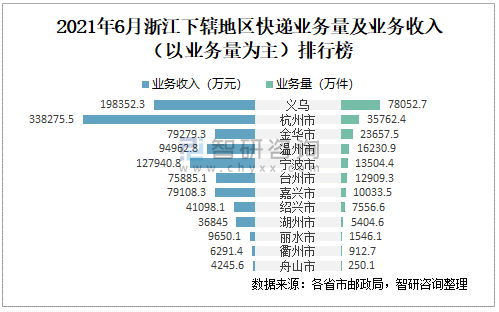 2021年6月浙江下轄地區(qū)快遞業(yè)務(wù)量及業(yè)務(wù)收入(以業(yè)務(wù)量為主)排行榜