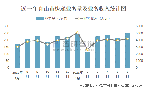 近一年舟山市快遞業(yè)務(wù)量及業(yè)務(wù)收入統(tǒng)計圖