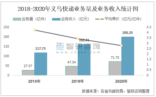 2018-2020年義烏快遞業務量及業務收入統計圖
