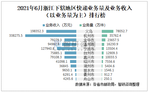 2021年6月浙江下轄地區快遞業務量及業務收入(以業務量為主)排行榜