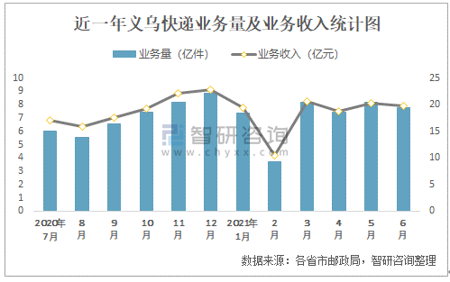 根據各省市郵政局數據可知:2021年6月義烏快遞業務量為78052.7萬件,業務收入為198352.3萬元;2021年1-6月義烏快遞累計業務量為427370.5萬件,同比增長46.5%,累計業務收入為1096046.3萬元,同比增長28.1%;2018-2020年義烏快遞業務量與業務收入均逐年遞增,平均單價逐年遞減。