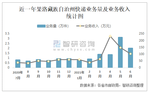 近一年果洛藏族自治州快遞業務量及業務收入統計圖
