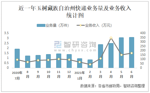 根據(jù)各省市郵政局數(shù)據(jù)可知:2021年6月玉樹藏族自治州快遞業(yè)務量為3.06萬件,業(yè)務收入為172.73萬元;2021年1-6月玉樹藏族自治州快遞累計業(yè)務量為12.63萬件,同比增長75.98%,累計業(yè)務收入為670.33萬元,同比增長101.63%。