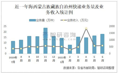近一年海西蒙古族藏族自治州快遞業務量及業務收入統計圖