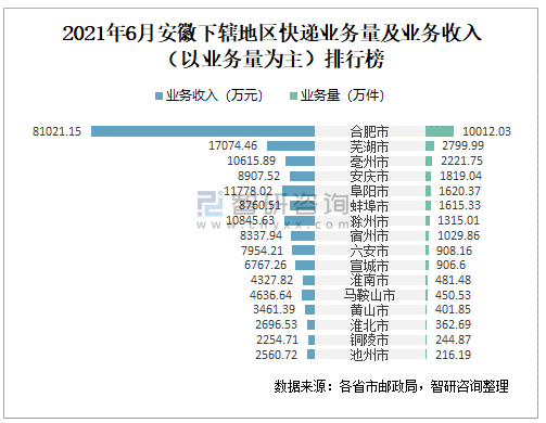 2021年6月安徽下轄地區快遞業務量及業務收入(以業務量為主)排行榜