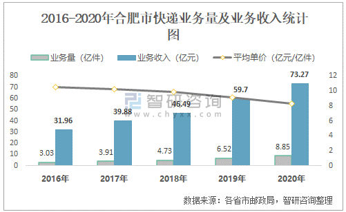 根據各省市郵政局數據可知:2021年6月合肥市快遞業務量為10012.03萬件,業務收入為81021.15萬元;2021年1-6月合肥市快遞累計業務量為52438.7萬件,同比增長39.45%,累計業務收入為399261.01萬元,同比增長25.58%;2016-2020年合肥市快遞業務量與業務收入均逐年遞增,平均單價逐年遞增。