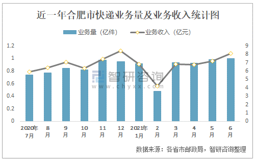 近一年合肥市快遞業務量及業務收入統計圖