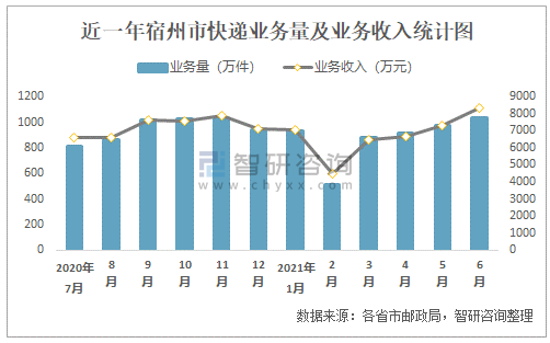 近一年宿州市快遞業(yè)務(wù)量及業(yè)務(wù)收入統(tǒng)計(jì)圖
