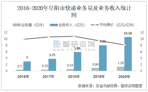 2016-2020年阜陽市快遞業務量及業務收入統計圖