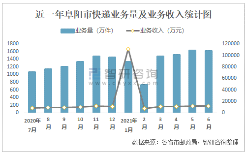 2021年6月阜陽市快遞業務量與業務收入分別為1620.37萬件和11778.02萬元