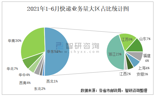 根據各省市郵政局數據可知:2021年1-6月快遞業務量主要集中在華東、華南、華北地區;2021年1-6月快遞業務量地區分布不均勻,其中華東地區占比最大,特別是浙江省貢獻了最多業務量;2021年6月安徽省下轄地區快遞業務量及業務收入排行榜中,阜陽市快遞業務量排名第5。