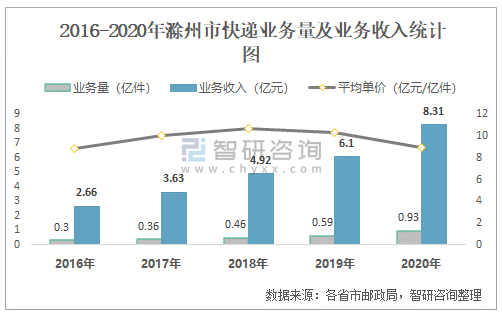 2016-2020年滁州市快遞業務量及業務收入統計圖