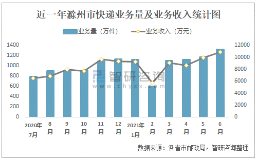 根據各省市郵政局數據可知:2021年6月滁州市快遞業務量為1315.01萬件,業務收入為10845.63萬元;2021年1-6月滁州市快遞累計業務量為6407.24萬件,同比增長79.6%,累計業務收入為53453.02萬元,同比增長51.5%;2016-2020年滁州市快遞業務量與業務收入均逐年遞增,平均單價存在一定的幅度的波動。