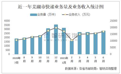 近一年蕪湖市快遞業(yè)務(wù)量及業(yè)務(wù)收入統(tǒng)計(jì)圖