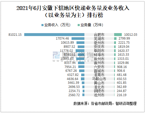 2021年6月安徽下轄地區(qū)快遞業(yè)務(wù)量及業(yè)務(wù)收入(以業(yè)務(wù)量為主)排行榜