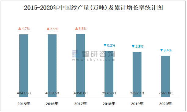 2015-2020年中國紗產(chǎn)量及增長情況統(tǒng)計(jì)圖