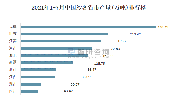 2021年1-7月中國紗各省市產(chǎn)量排行榜