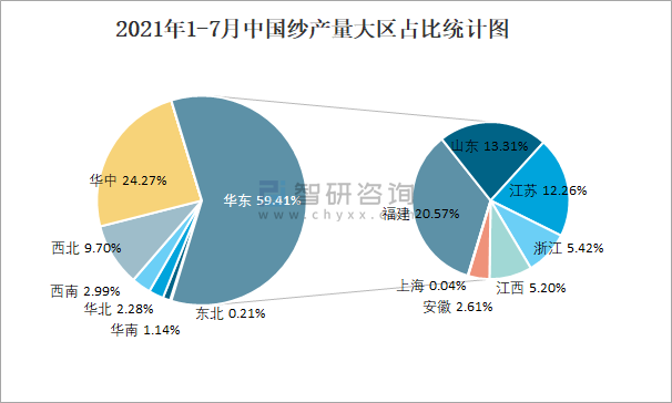 2021年1-7月中國紗產(chǎn)量大區(qū)占比統(tǒng)計(jì)圖