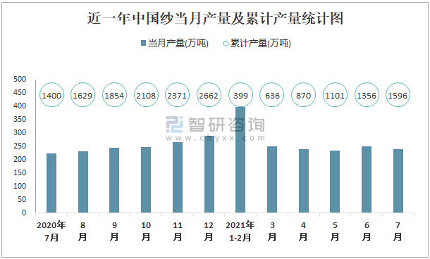 近一年中國紗當(dāng)月產(chǎn)量及累計(jì)產(chǎn)量統(tǒng)計(jì)圖