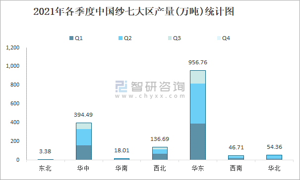 2021年各季度中國紗七大區(qū)產(chǎn)量統(tǒng)計(jì)圖