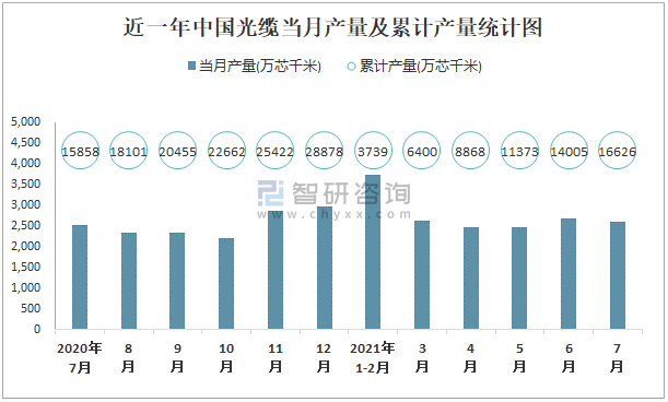 近一年中國(guó)光纜當(dāng)月產(chǎn)量及累計(jì)產(chǎn)量統(tǒng)計(jì)圖