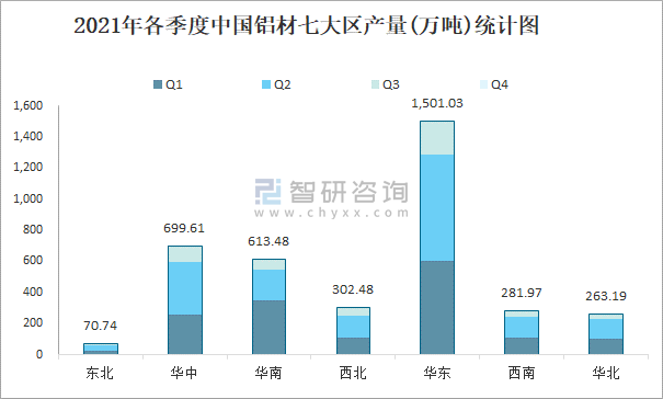 2021年各季度中國鋁材七大區產量統計圖
