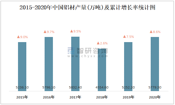 2015-2020年中國鋁材產量及增長情況統計圖