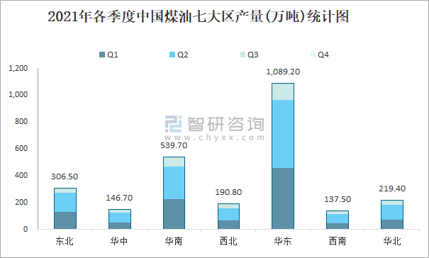 2021年各季度中國煤油七大區(qū)產(chǎn)量統(tǒng)計圖