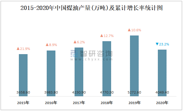 2015-2020年中國煤油產(chǎn)量及增長情況統(tǒng)計圖