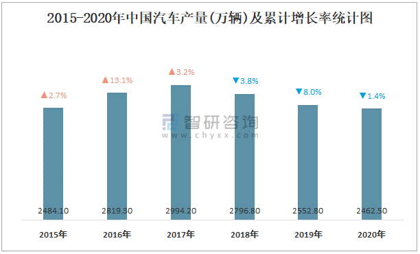 2015-2020年中國汽車產(chǎn)量及增長情況統(tǒng)計圖