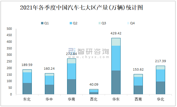 2021年各季度中國汽車七大區(qū)產(chǎn)量統(tǒng)計圖