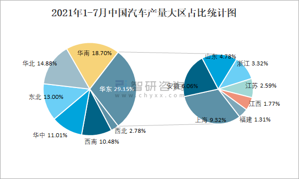 2021年1-7月中國汽車產(chǎn)量大區(qū)占比統(tǒng)計圖
