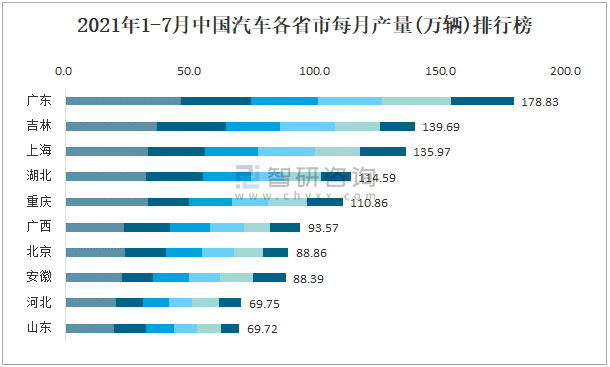 2021年1-7月中國汽車各省市每月產(chǎn)量排行榜
