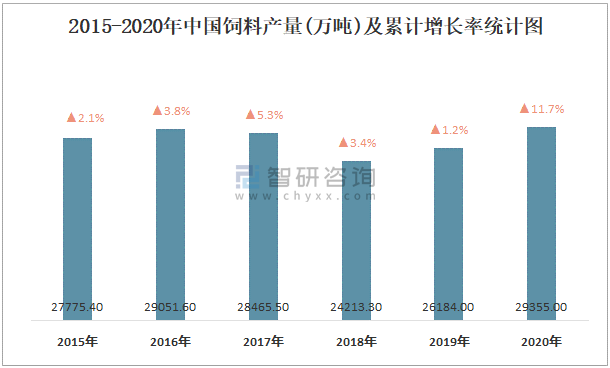 2015-2020年中國飼料產量及增長情況統計圖