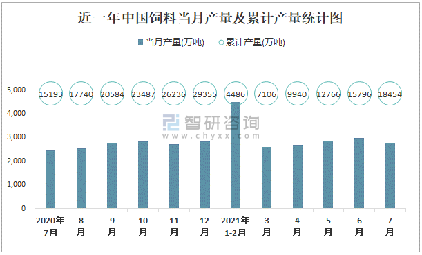 近一年中國飼料當月產量及累計產量統計圖
