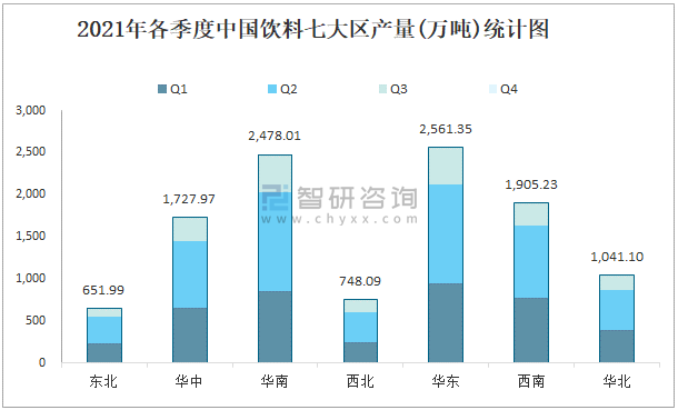 2021年各季度中國(guó)飲料七大區(qū)產(chǎn)量統(tǒng)計(jì)圖