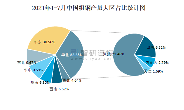 2021年1-7月中國(guó)粗鋼產(chǎn)量大區(qū)占比統(tǒng)計(jì)圖