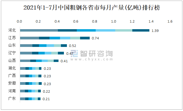 2021年1-7月中國(guó)粗鋼各省市每月產(chǎn)量排行榜