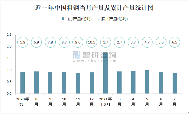 根據(jù)國(guó)家統(tǒng)計(jì)局?jǐn)?shù)據(jù)顯示:2021年7月中國(guó)粗鋼產(chǎn)量為0.9億噸,同比下降8.4%;2021年1-7月中國(guó)粗鋼累計(jì)產(chǎn)量為6.5億噸,累計(jì)增長(zhǎng)8%;2015-2020年中國(guó)粗鋼產(chǎn)量逐年遞增,2020年達(dá)到最高。
