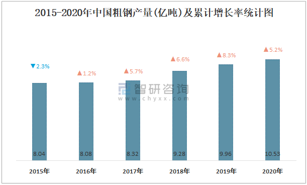 2015-2020年中國(guó)粗鋼產(chǎn)量及增長(zhǎng)情況統(tǒng)計(jì)圖