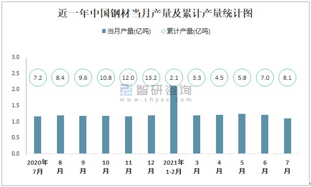 根據國家統計局數據顯示:2021年7月中國鋼材產量為1.1億噸,同比下降6.6%;2021年1-7月中國鋼材累計產量為8.1億噸,累計增長10.5%;2015-2020年中國鋼材產量2017年起逐年遞增,2020年達到最大值。