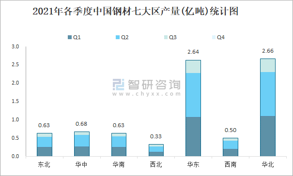 2021年各季度中國鋼材七大區產量統計圖