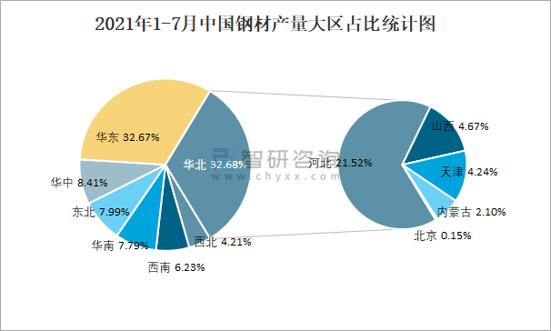 2021年1-7月中國鋼材產量大區占比統計圖
