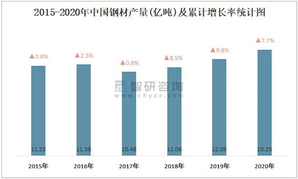 2015-2020年中國鋼材產量及增長情況統計圖